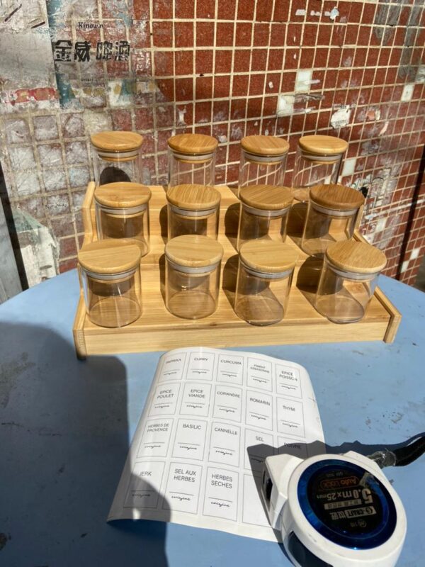 Organize your spices in style with this 12-piece glass spice jar set. Featuring natural bamboo lids and a sleek stand, it’s perfect for storing salt, pepper, herbs, and seasonings in a neat, modern kitchen.