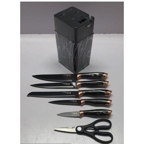 Upgrade your kitchen with the Marble Profile Knife Set – stylish, sharp, and complete with a block stand that includes a built-in sharpener.